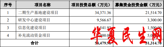 舒华体育最终募集资金净额较原计划无差额。招股说明书显示,公司拟募集资金3.13亿元,分别用于二期生产基地建设项目、研发中心建设项目、信息化建设项目、补充流动资金项目。