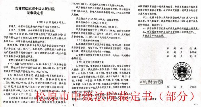 以上法院查明的债权债务情况,正好印证了239名债权人举报材料中提到的债权债务数字。但是,松原市中级法院以(2019)吉07民破8号之二民事裁定书批准了东镇律所作为破产管理人做出的松原程亿房地产开发有限公司破产重整计划草案,并终止了该公司的重整程序。