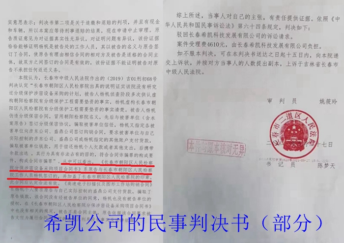 在此期间,被害企业还申请法院委托第三方机构对合同上加盖的朝阳区检察院公章进行了鉴定,鉴定结论是:合同上加盖的公章与朝阳区检察院的公章是一枚公章。日前,希凯公司因不服(2021)吉0105民初1623号民事判决书已经提出上诉。