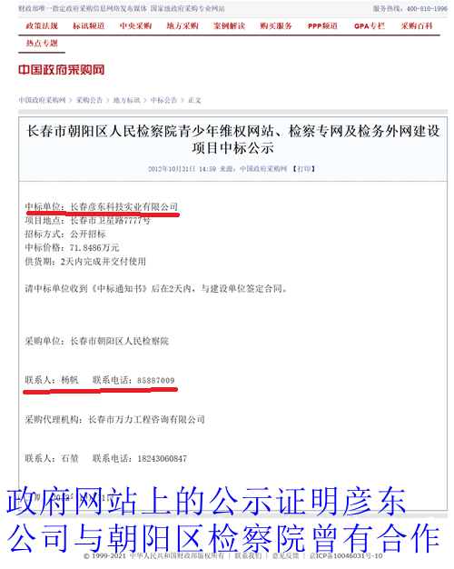 被害企业老板们说:合同上加盖了检察院公章和检察长的法人章后,他们还是不放心,又到政府网站上查询一番。在中国政府采购网上,他们查询到了“长春市朝阳区检察院计算机设备采购项目公开招标公告”。这份公告明确证明:朝阳区检察院的设备采购负责人就是杨帆!他们还查询到,长春盛鼎科技有限公司(简称盛鼎公司)和彦东公司就是该院设备采购招标的中标单位!