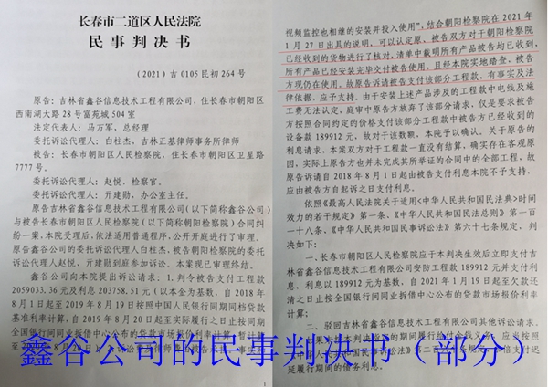 长春市二道区法院作出的(2021)吉0105民初264号民事判决书称:“结合朝阳检察院在2021年1月27日出具的说明,可以认定原、被告双方对于朝阳检察院已经收到的货物进行了核对,清单中载明所有产品被告均已收到,所有产品已经安装完毕交付被告使用,且经本院实地踏查、被告方现仍在使用。故原告诉请被告支付该部分工程款,有事实及法律依据,应子支持。”但仍称“本案系基于杨帆实施诈骗行为导致原告财产损失的事实而引发的纠纷”。也就是说,此案仅仅是杨帆个人实施的诈骗案子,与检察院无关!