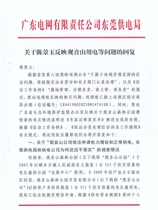 观音山公园收到了10月7日下发的广东电网有限责任公司东莞供电局的《关于陈景玉反映观音山用电等问题的回复》做了如下答复:一是关于“观音山公司依法申请电力增容和正常供电,东莞供电局和供电公同为何迟迟不落实”的调查情况。我局与观音山公司签订的《供用电合同》已约定产权分界点,并已按约定供电至观音山公园用电地城范围,至今一直正常用电.观音山公园对红线区域内的用电规划需求,应由观音山公园自行规划建设,可委托有资质的施工单位开展。