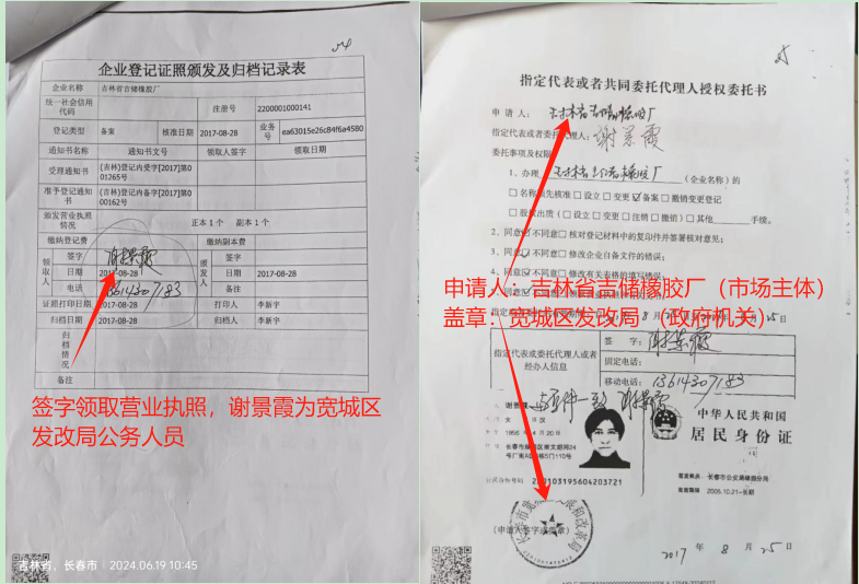 5、吉储橡胶厂营业执照在 2005 年已经被吊销。吉林省市场监管厅在 2017年8月28日再次颁发并由宽城区发改局授权的指定代理人谢景霞(宽城区发改局公务人员)领取新的吉林省吉储橡胶厂营业执照,严重违反了《中华人民共和国企业登记管理条例》的规定。