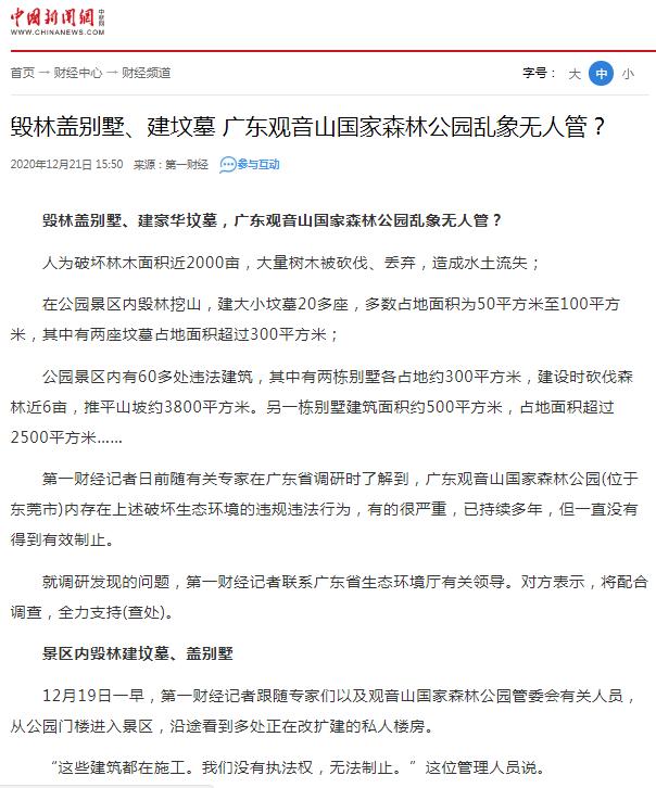 这些情景,可以参考媒体报道的:《国家4A级森林公园竟藏22栋私人别墅》、《20余年间 广东观音山国家森林公园约2000亩生态林被毁 如何破解?》、《4A景区被”毁容” 观音山森林公园遭毁林破坏生态》、《植树节前夕观音山再现毁林乱象,东莞生态保护环境亟待重塑!》、《广东观音山国家森林公园毁林种果为何屡禁不止?》、《从“两高”发布生态环保检察公益诉讼看观音山千亩毁林能否被查》、《观音山国家森林公园二十年被毁林近二千余亩 林长是何表态》、《国家多部门合力守护林草资源,观音山原始次森林被破坏该有人管了》、《观音山国家森林公园毁林、修编真相揭秘》、《盘踞广东观音山国家森林公园违建缘何成“不倒翁”》、《从东莞观音山违建别墅看当地营商环境的现实与隐忧》、《广东深化林长制改革,东莞观音山毁林违建问题能否迎来“终结篇”?》、《评:东莞观音山森林公园毁林现象屡禁不止,谁之责?》、《东莞构建全方位控违治违体系 观音山大量违建无人理》......