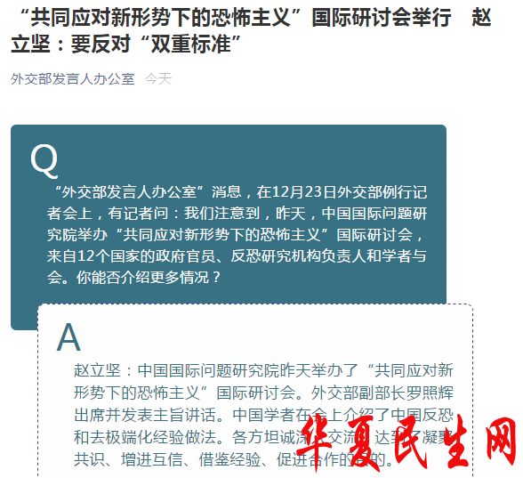 中国网12月23日讯 据“外交部发言人办公室”官方微信公众号消息,针对中国国际问题研究院举办“共同应对新形势下的恐怖主义”国际研讨会一事,中国外交部发言人赵立坚在今日例行记者会上表示,国际反恐合作要坚定捍卫国际共识,要积极采取有效行动,要坚持统一标准,要坚决铲除恐怖土壤。