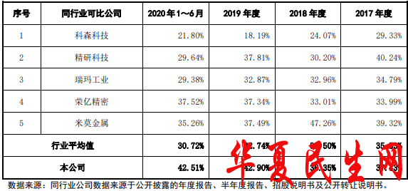 2017年、2018年、2019年、2020年1-6月,福立旺综合毛利率分别为37.43%、36.35%、42.90%、42.51%,同行业可比公司毛利率平均值分别为35.53%、33.50%、32.74%、30.72%。福立旺毛利率呈上升趋势并且总体高于同行业可比公司的平均水平。不过,行业平均值是呈下滑趋势。2019年度、2020年1-6月,福立旺的毛利率“夺冠”,均高于同行业可比公司。