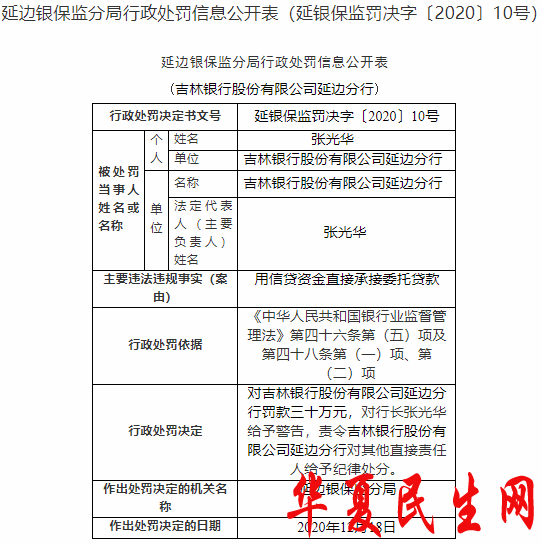根据《中华人民共和国银行业监督管理法》第四十六条第(五)项及第四十八条第(一)项、第(二)项,延边银保监分局对吉林银行延边分行罚款30万元,对行长张光华给予警告,责令吉林银行延边分行对其他直接责任人给予纪律处分。