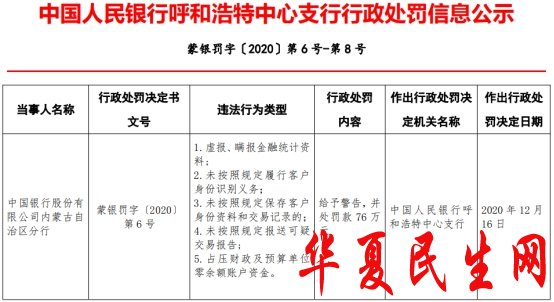中国经济网北京12月23日讯 央行网站昨日发布中国人民银行呼和浩特中心支行行政处罚信息(蒙银罚字[2020]第6号-第8号),中国银行内蒙古自治区分行存在虚报、瞒报金融统计资料;未按照规定履行客户身份识别义务;未按照规定保存客户身份资料和交易记录的;未按照规定报送可疑交易报告;占压财政及预算单位零余额账户资金等5宗违法违规行为,中国人民银行呼和浩特中心支行对其给予警告,并处罚款76万元。