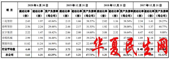 上述同期,同行业上市公司的资产负债率均值分别为29.44%、32.59%、29.28%和29.04%,流动比率均值分别为3.45、2.98、3.73、4.40,速动比率均值分别为2.29、1.68、3.16、3.77。