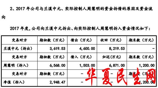 其中关联方资金拆借指2017年公司一方面从实际控制人周慧明拆入资金,另一方面向周慧明控制的兰溪中元拆出资金。
