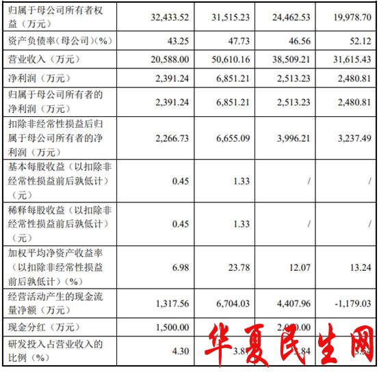 2017年至2020年6月,宏昌科技实现营业收入分别为31,615.43万元、38,509.21万元、50,610.16万元和20,588.00万元,净利润分别为2480.81万元、2513.23万元、6851.21万元和2391.24万元。