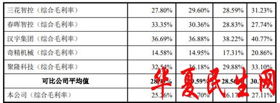 上述同期,宏昌科技的综合毛利率分别为27.11%、26.17%、29.70%、25.26%,同期可比公司综合毛利率均值分别为30.74%、28.56%、29.59%、28.99%。