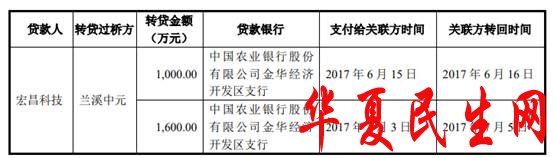 其中关联方资金拆借指2017年公司一方面从实际控制人周慧明拆入资金,另一方面向周慧明控制的兰溪中元拆出资金。银行借款转贷指2017年和2018年,宏昌科技在取得银行借款时,存在为满足银行对贷款资金用途的监管要求,将取得的银行贷款支付给关联方兰溪中元,然后由兰溪中元于当日或者间隔几日将资金划转回公司其他银行账户的情况。