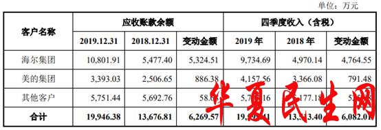 2019年末,宏昌科技的应收账款余额较2018年增长6269.57万元,其中公司对海尔集团、美的集团的应收账款分别增长5324.51万元、886.38万元,是公司应收账款余额增长的主要来源。