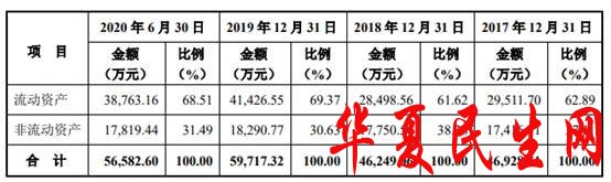 2017年至2020年上半年各期末,宏昌科技的资产总额分别为46,928.41万元、46,249.06万元、59,717.32万元、56,582.60万元。其中,流动资产的金额分别为29,511.70万元、28,498.56万元、41,426.55万元、38,763.16万元,占总资产的比例分别为62.89%、61.62%、69.37%、68.51%。