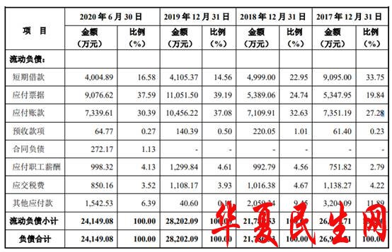 2017年至2020年上半年各期末,宏昌科技的负债合计26,949.71万元、21,786.53万元、28,202.09万元和24,149.08万元,全部为流动负债。公司流动负债主要为短期借款、应付票据、应付账款。