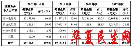 宏昌科技的产品主要是流体电磁阀、模块化组件和水位传感器。2017年至2020年上半年,公司流体电磁阀产品的销售收入分别为20,805.86万元、25,236.50万元、31,597.57万元和12,259.16万元,占主营业务收入的比例分别为65.99%、65.75%、63.00%和60.09%,占比呈逐年降低的趋势。