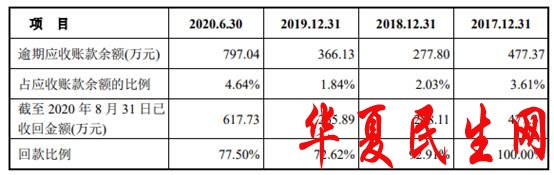2017年至2020年上半年各期末,宏昌科技的逾期应收账款金额分别为477.37万元、277.80万元、366.13万元、797.04万元,占应收账款余额的比例分别为3.61%、2.03%、1.84%、4.64%。