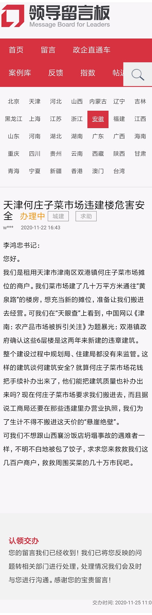 11月22日,天津市民在人民网地方领导留言板反映《天津何庄子菜市场违建楼危害安全》。11月25日,天津回复称已转交相关部门处理。然而近日,本网接知情人反映称上述何庄子菜市场的“违建危楼”已安排商户入驻并正式开业,津南区有关部门接到群众反映后,虽然第一时间采取措施,但却收效甚微。