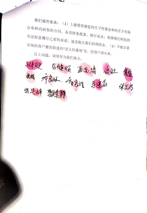 并“强烈要求:(1)上级领导督促何庄子村委会和何庄子市场公布和冯丽签的合同、各项财务报表、银行流水;保障我们村民的合法权益,履行之前的承诺,退还拖欠我们的保险金;(2)不能让菜市场的商户搬到新建的“活人的墓地”里,把商户清出来”。