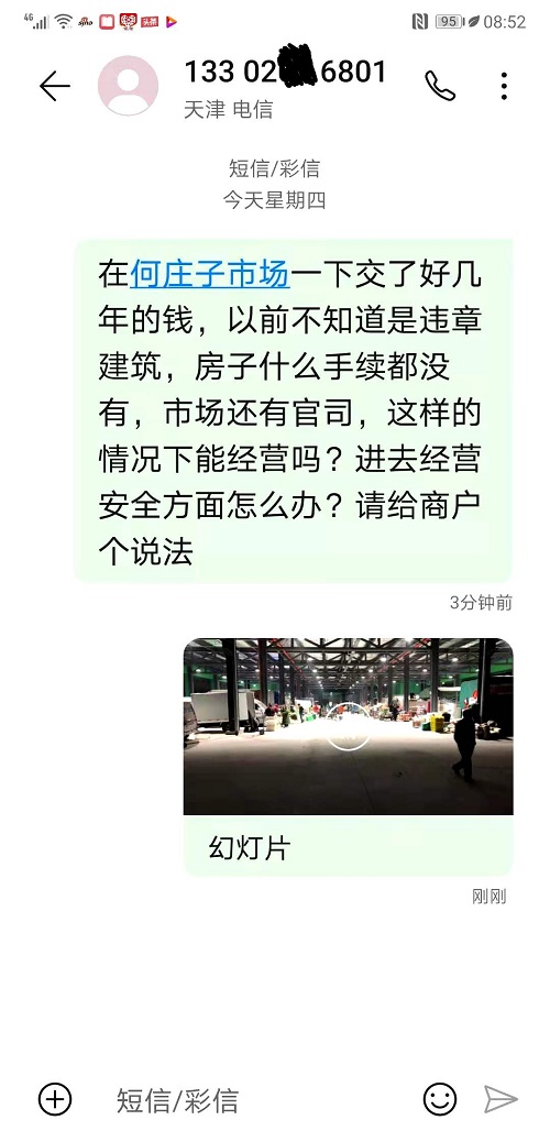 然而,近日有知情人反映,何庄子菜市场已于12月3日安排商户入驻上述“违建危楼”,并正式营业,知情人已向津南区、双港镇两级党政机关高层领导反映。