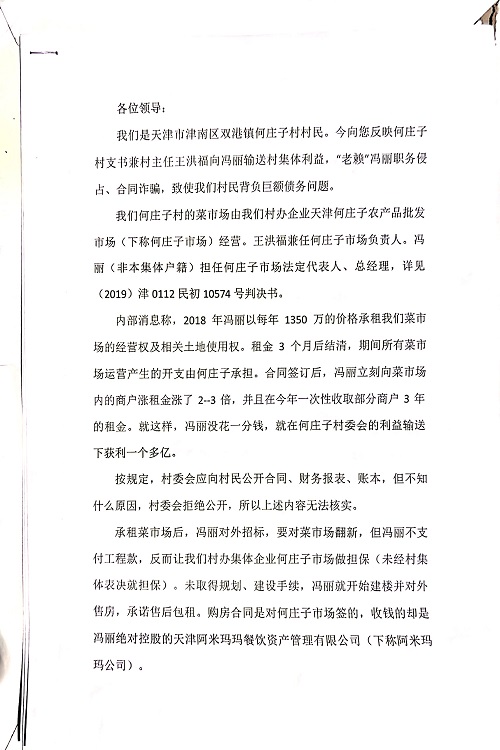 部门村民代表联名向本网递交材料,“反映何庄子村支书兼村主任王洪福向冯丽输送村集体利益,“老赖”冯丽职务侵占、合同诈骗,致使我们村民背负巨额债务问题”。