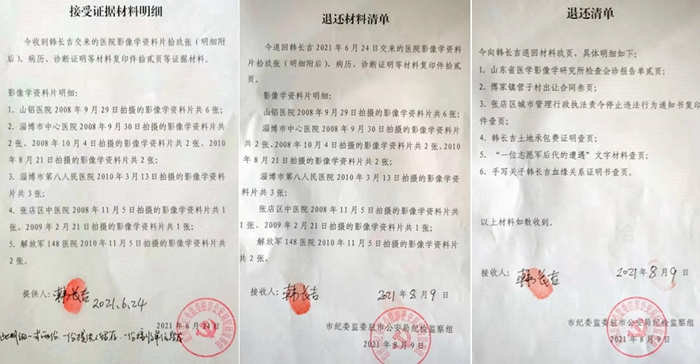 韩长吉介绍:2021年3月23日,他把媒体曝光的文章打印后和相关的证据材料,分别实名邮寄给了淄博市纪委、山东省政法教育指导组。2021年4月27日下午两点半,市纪委驻市公安局纪检组荆书记给他打电话,让他去办公室了解情况。因自己病情严重,拖到5月12日,他在妻子搀扶下来到了市公安局信访室。荆书记详细了解了他被打残的情况后说:“你放心,我们这次就是针对你的情况打保护伞的,你回去耐心等待,十五个工作日,一定给你一个满意的答复”。他心里想,这下总算看到了希望。