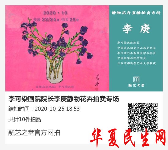 10月22日下午,李可染画院院长李庚新作静物花卉拍卖在融艺之堂艺术家平台正式开拍,以限时直播方式进行拍卖,至10月25日结拍。一朵朵色彩浪漫、激情烈烈的芳华绽放,一片片嫣红姹紫、明黄幽蓝的彩卉流奔,大块颜色,花事幽微,每一幅都似在触碰出一花世界的芥子须弥之相。李庚先生明艳深厚的创作甫一面世,讯速引起美术界业内人士关注。