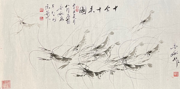 墨痴追求墨色至上,情感至上,意境至上,视觉至上,他用才情和修养,荡尽尘埃浊物,他充分利用造型本领,笔墨神韵,让每一笔都有出处,让每一笔都经得起推敲,让每一笔都能流传下去。他妙笔绘就的群虾,千姿百态,栩栩如生,灵动有趣,暗香涌动,呼之欲出,真正做到:一虾一神态,一虾一景观,一虾一妙韵。著名书法家米南阳先生曾作诗云:“白石画虾堪称雄,只惜不在人世中。天恐此技猷决断,再生墨痴我老兄。”他的画作在市场上很受欢迎,他都是客户至上,情意至高。