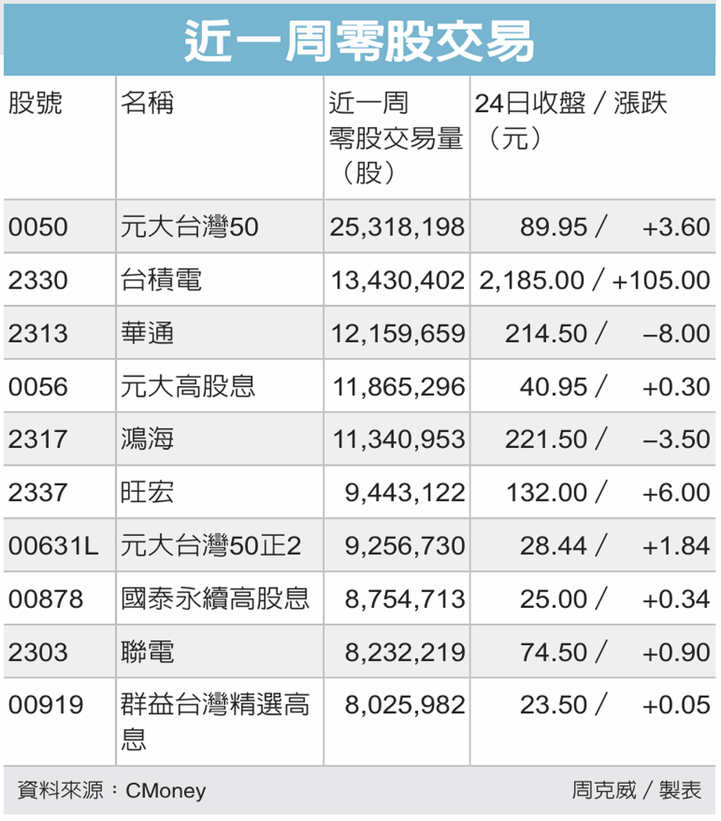 根据CMoney统计,本周热门零股前十强标的依序为,元大台湾50、台积电、华通、元大高股息、鸿海、旺宏、元大台湾50正2、国泰永续高股息、联电、群益台湾精选高息,十档标的交易量从2,531万股至802万股,相较上周呈现持平状态。