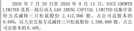 公告还显示,2020年7月20日至2020年9月15日,NICE GROWTH LIMITED及其一致行动人GAO ZHENG CAPITAL LIMITED以集中竞价方式减持三只松鼠股份241.20万股,占三只松鼠总股本的0.60%,以大宗交易方式减持三只松鼠股份159.80万股,占公司总股本的0.40%。