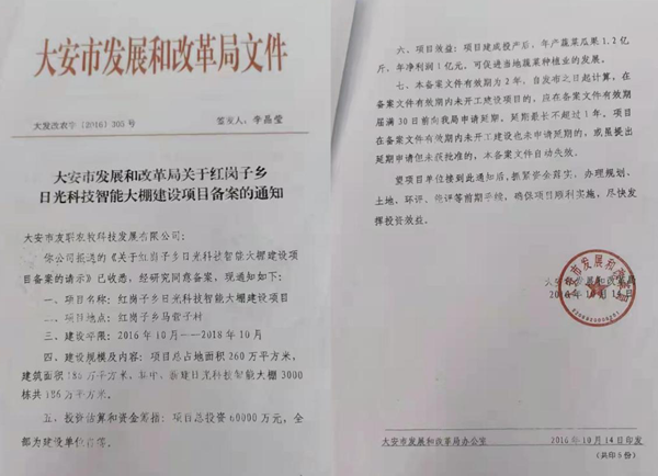 2016年11月3日,在大安市政府召开的关于红岗子乡日光科技智能大棚项目调度会上,与会的工作人员表示“6亿项目”法定代表人存在诈骗嫌疑。