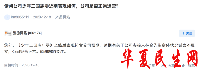 深交所互动易显示,12月18日,游族网络在回答投资者提问时表示,有关于公司实控人林奇先生身体状况谣言不属实,公司经营正常。
