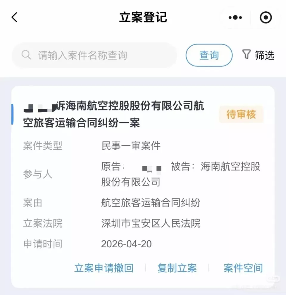 4月20日,胡双已正式向深圳宝安区人民法院提交诉状,要求海南航空赔偿他登机前一晚103.84元的住宿费,并承担相关诉讼费用。目前该案正处于待审核立案状态。