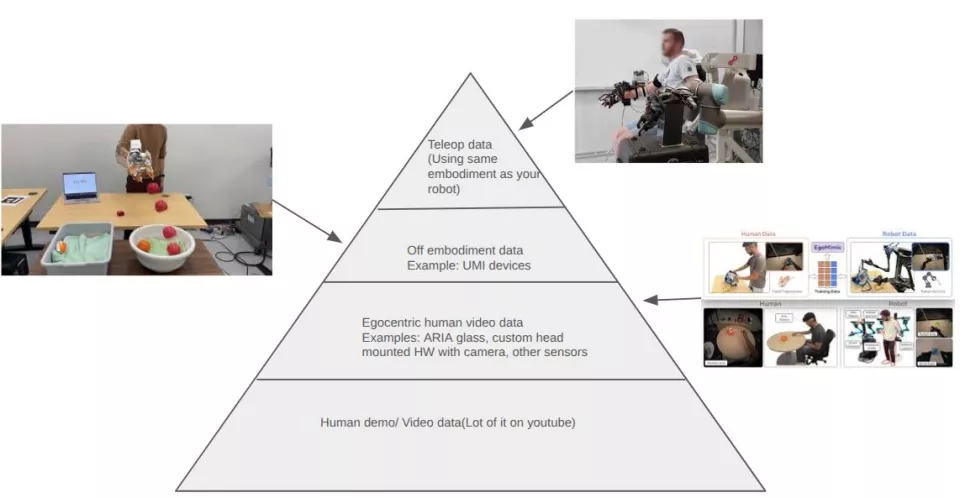 行业里有一个著名的数据金字塔。最底层是互联网上现成的视频和图片,量大管够,但精度太低,机器人看着人类做饭的 YouTube