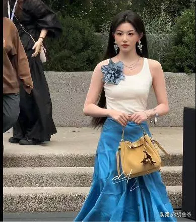 张艺凡当天穿了一件蓝色吊带裙,手腕搭了条丝巾,看上去走温柔松弛风,可脚上搭配的平底拖鞋,直接拉低了整体质感。