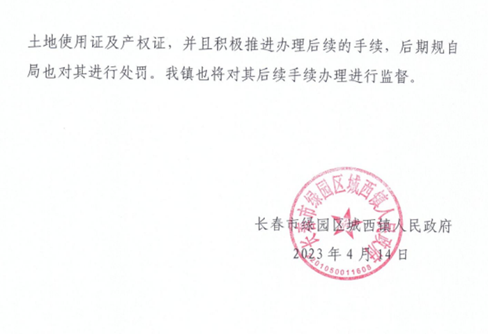 城西镇政府的处理意见是:“2020年4月26日,我镇下达《责令停止施工通知书》,2020年5月11日,下达《责令拆除告知书》。2020年5月25日下达《责令拆除决定书》,由于长春市成杰建材有限公司提供了相关土地使用证及产权证,并且积极推进办理后续的手续,后期规自局也对其进行处罚。我镇也将对其后续手续办理进行监督。”