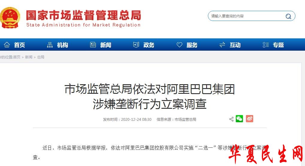 市场监管总局:依法对阿里巴巴集团涉嫌垄断行为立案调查