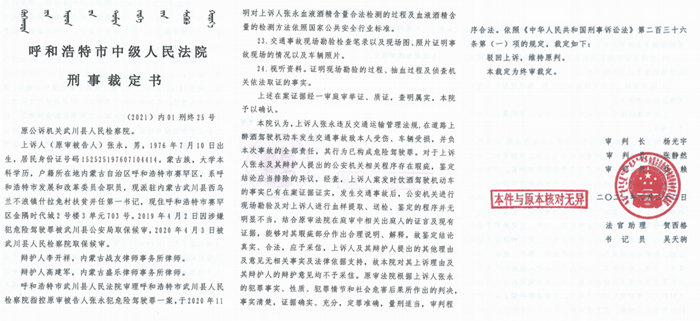 本案的证据链条明显出现程序严重违规、血样数量前后矛盾、鉴定过程逻辑混乱、鉴定人员行为存疑、原始档案未依法提供等诸多瑕疵,但武川县与呼和浩特市两级法院的承办法官却爱莫能助,反因不审案的人员定案,导致本案一审历经七个月远超审限后,才以危险驾驶罪判决本人拘役一个月十五日,并处罚金人民币3000元。本人对此判决不服,特提起上诉,呼和浩特市中级人民法院经延期后,又以(2021)内01刑终25号刑事裁定书驳回上诉、维持原判。