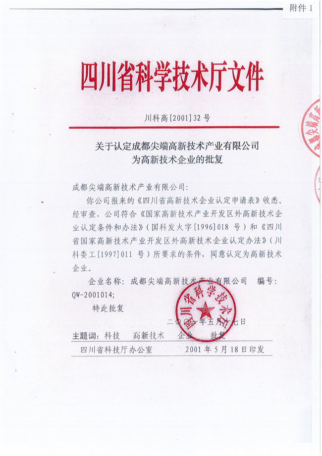 周兴和任董事长的成都尖端公司2001年获得高新技术企业称号