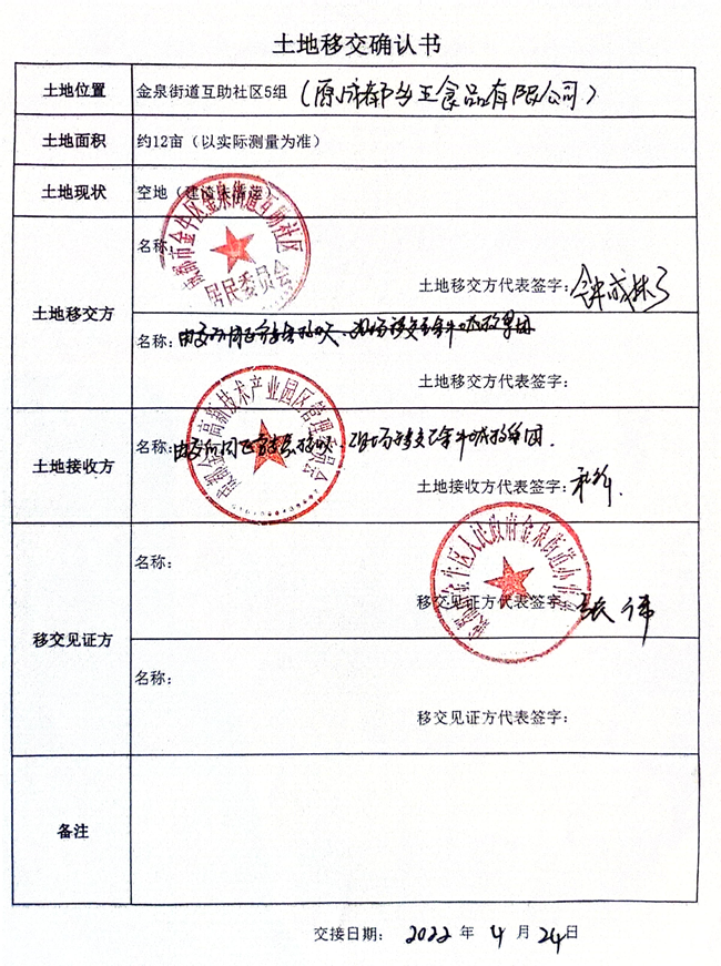 成都金牛区高管委,于2022年4月24日,把成都尖端公司土地证名下14亩土地移交给金牛城投集团,土地接收方代表签字人,是临时工