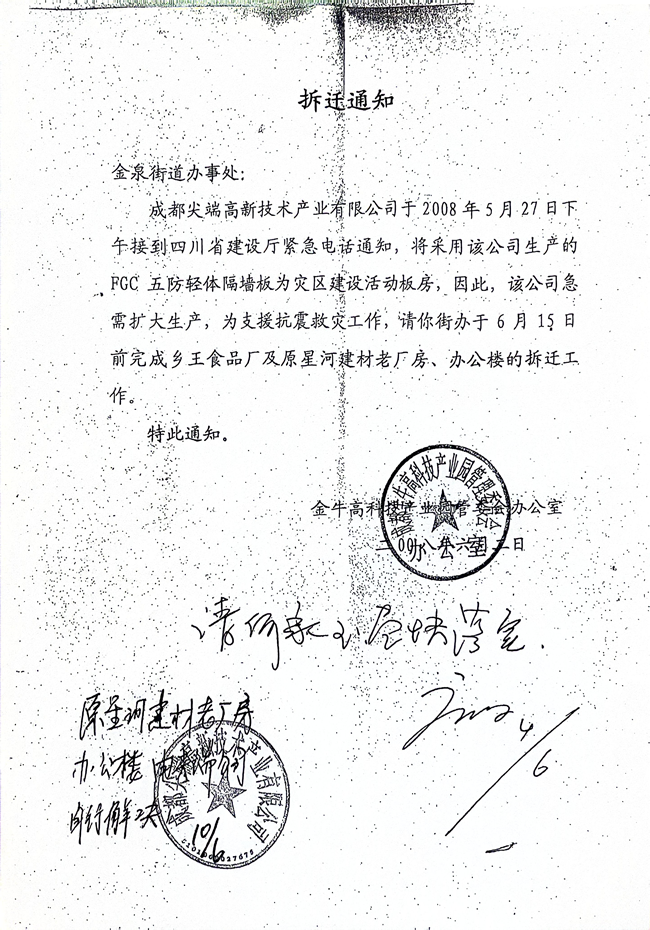 2008年6月2日,金牛区领导、金牛区高管委责成金泉街道办必须6月15日拆迁完交地给成都尖端公司,生产周兴和发明的建筑板材,支援抗震救灾工作