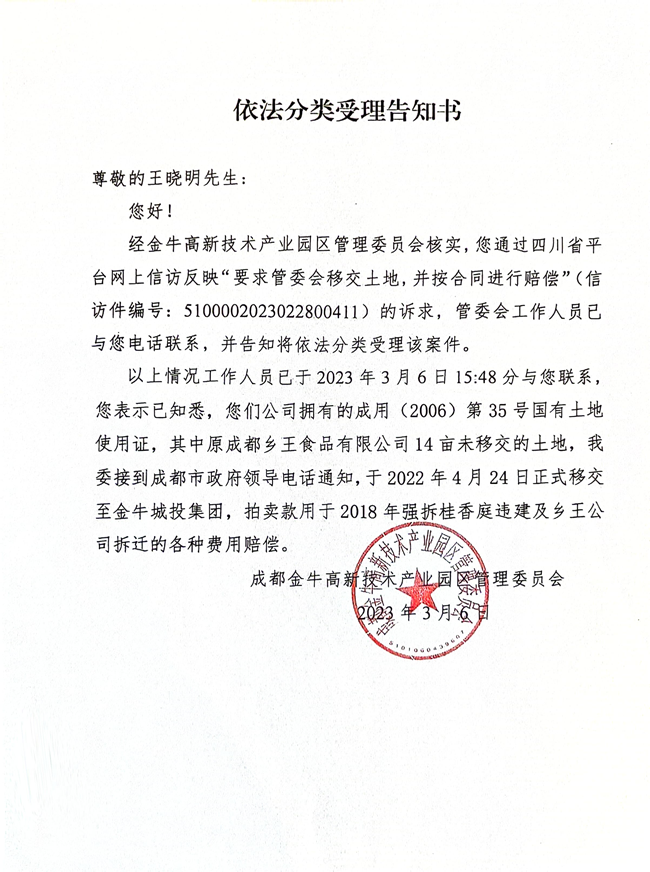 采访未入主题,大家兴奋得不行,快结束了,金牛区高管委王世心主任、金牛执法局李俊局长、金泉街道办李旭东主任、副主任张华,四位领导站起来,抑制不住兴奋地对记者说,我们集体讨论于2023年3月6日给周兴和的女婿,成都尖端公司不是法人,也不是负责人的王晓明先生,邮寄了“依法分类受理告知书”,告知书编号:5100002023022800411,告知:您们公司拥有的(2006)第35号国有土地使用证,其中原成都乡王食品有限公司14亩未移交的土地,我委接到成都市政府领导电话通知,于2022年4月24日正式移交至金牛城投集团,拍卖款用于2018年强拆桂香庭违建及乡王公司拆迁的各种费用赔偿和2022年4月24日土地移交确认书,明确告知王晓明,土地移交给金牛区城投集团了。这么长时间,王晓明也未提出异议,就算是默认吧。