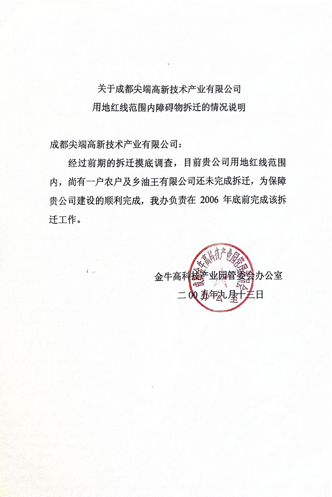 【金牛区高管委,2005年9月13日承诺,2006年底前完成拆迁交地给成都尖端公司】